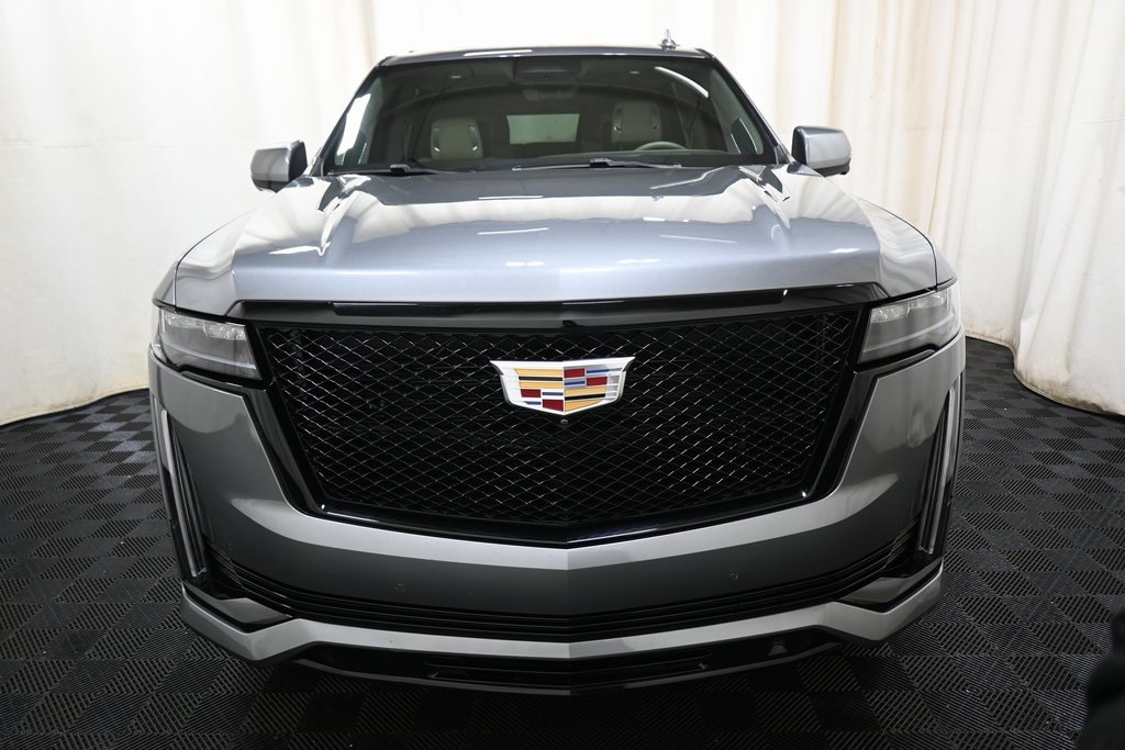 2021 Cadillac Escalade Sport Platinum Satin Steel Metallic 6.2L V8 4WD 10-Speed Automatic with Overdrive 4WD, Whisper Beige With Gideon Accents Leather, 16.9" Diagonal OLED Infotainment Screen, 4-Way Power Driver Lumbar Seat Adjuster, 4-Way Power Front Passenger Lumbar Seat Adjuster, 4-Wheel Disc Brakes, 8-Way Power Driver Seat Adjuster, 8-Way Power Front Passenger Seat Adjuster, A/V remote, ABS brakes, Adaptive Cruise Control, Adaptive suspension, Air Ionizer, Air Ride Adaptive Suspension, AKG Studio Reference 36-Speaker Audio System, AM/FM radio: SiriusXM with 360L, Apple CarPlay/Android Auto, Auto High-beam Headlights, Auto tilt-away steering wheel, Auto-dimming Rear-View mirror, Automatic Seat Belt Tightening, Automatic temperature control, Body-Color Door Handles, Cooled Console w/Covered Storage, Door Lock & Latch Shields, Driver Assist Tech Package, Driver door bin, Driver vanity mirror, Electronic Limited-Slip Differential, Enhanced Automatic Emergency Braking, Enhanced Automatic Parking Assist, Floor Console w/Covered Storage, Front Bucket Seats, Front dual zone A/C, Fully automatic headlights, Glass Breakage Sensor, HD Radio, Heads-Up Display, Heated & Ventilated Driver & Front Passenger Seats, Heated door mirrors, Heated Driver & Front Passenger Seats, Heated front seats, Heated steering wheel, Hitch Guidance w/Hitch View, Illuminated entry, Illuminating Front & Rear Sill Plates, In-Vehicle Trailering System App, Integrated Trailer Brake Controller, Lane Keep Assist w/Lane Departure Warning, Magnetic Ride Control Suspension, Memory seat, Navigation System, Outside temperature display, Platinum Interior Trim, Power Liftgate, Power Panoramic Tilt-Sliding Sunroof, Preferred Equipment Group 1SH, Puddle Lamps w/Cadillac Crest (LPO), Radio: AM/FM/SiriusXM w/Navigation, Rear Camera Mirror, Rear Camera Mirror Washer, Rear Cross Traffic Alert, Rear Seat Entertainment System, Reconfigurable Full-Color Head-Up Display, Reverse Automatic Braking, Running Board Assist Steps, SiriusXM w/360L, Soft Closing Front & Rear Doors, Steering wheel memory, Steering wheel mounted audio controls, Teen Driver, Theft-Deterrent Alarm System, Traction control, Trailer Side Blind Zone Alert, Turn signal indicator mirrors, Vehicle Inclination Sensor, Vehicle Interior Movement Sensor, Voltmeter, Wireless Apple CarPlay/Wireless Android Auto.
